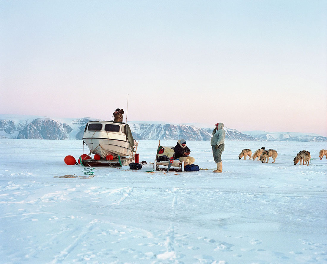 Nous sommes en 2013, à cette époque la Corée du Nord vient juste de prétendre avoir réussi ses premiers essais nucléaires. Je suis quelques instants sans voix : non seulement c’est la première fois que quelqu’un me parle anglais depuis de nombreux jours, mais surtout, alors que nous nous trouvons isolés de tout, au milieu de la banquise au-dessus des eaux les plus au nord du monde, la question géopolitique interpelle. Et est une belle leçon d’humilité. En discutant, j’apprends ainsi qui est Ussarqak Qujaukitsoq, personnalité politique, représentant de la culture Inuit dans le pays et à travers le monde. La discussion s’étire dans la soirée, il me parle aussi des difficultés de pouvoir subvenir de la chasse, de la question des quotas, et du casse-tête à résoudre pour réussir à limiter la dépendance à l’importation en nourriture, dans un pays où le climat empêche jusqu’à présent un développement de l’agriculture. Le campement se couche finalement vers 1h30 du matin, au milieu des craquements de la glace et des hurlements des chiens, encore baigné dans la luminosité du ciel – à cette période de l’année, au 77° parallèle nord, le ciel disparaît tout juste sous la ligne d’horizon.