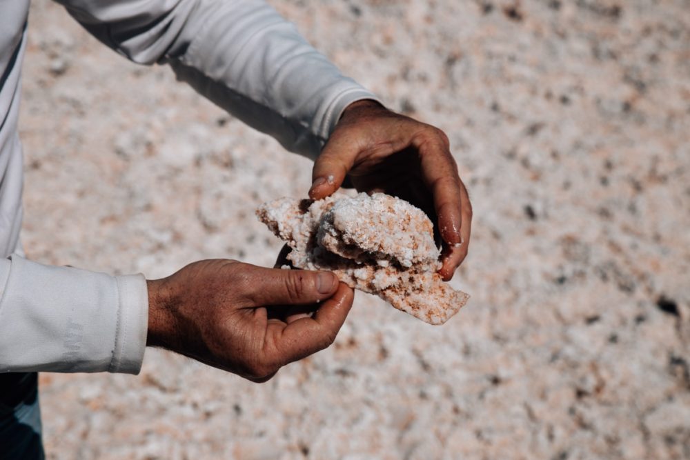Le deuxième jour, le réveil est matinal, une randonnée sur les dunes d’El d’Arenal non loin du village nous attend. Au premier effort, l’altitude se fait sentir, le souffle est court et les jambes sont lourdes de la veille. Après avoir crapahuté une petite heure, nous arrivons au point culminant qui offre un panorama exceptionnel sur les volcans chiliens. On aperçoit au loin le Llullaillaco, deuxième volcan actif le plus haut du monde, et le salar d’Arizaro. Nous traverserons le salar dans l’après-midi pour nous rendre au Cône d’Arita, une mystérieuse pyramide naturelle située au milieu du désert de sel. C’est un événement géologique encore non expliqué à ce jour. Après avoir lu plusieurs théories invraisemblables à son sujet au cours de quelques recherches, j’ai eu l’envie de le voir de mes propres yeux et de pouvoir mener ma propre enquête. Finalement, au bout de ce voyage, aucun argument ne me convint réellement. Si la piste d’un petit volcan souterrain à l’époque où le salar était encore une mer intérieure semble être la plus probable, elle est de loin la moins romantique.