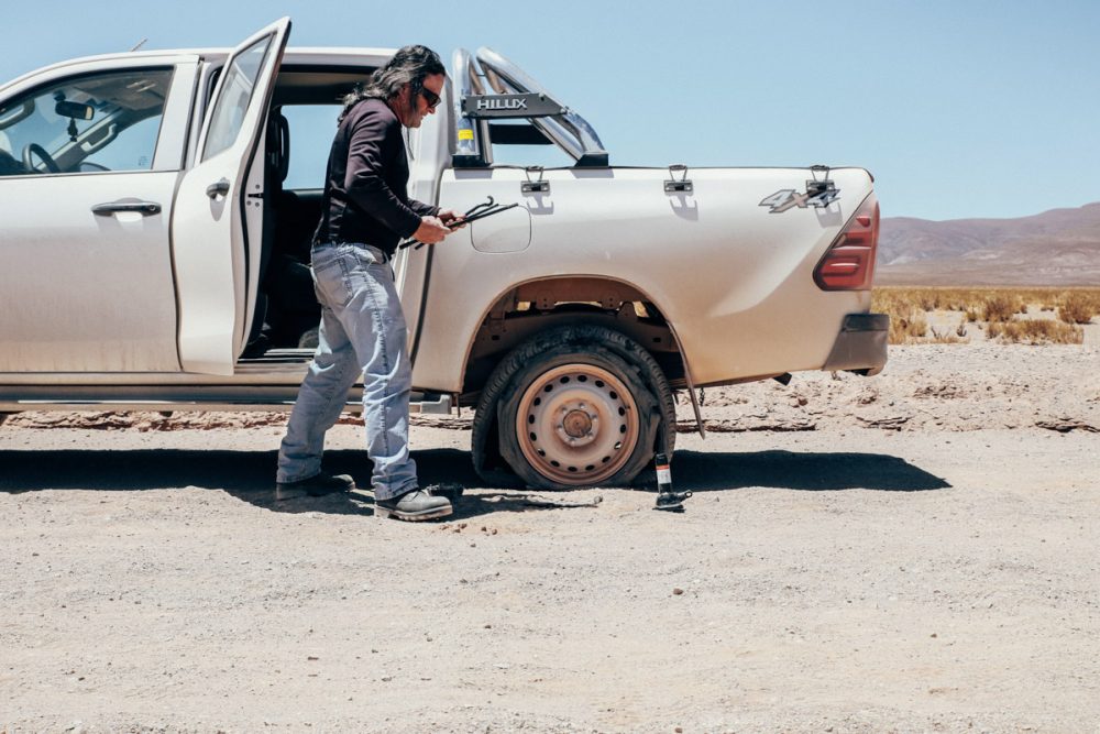Le dernier jour de trip arrive et nous quittons Tolar Grande des souvenirs plein la tête. La fin du voyage se profile à l’horizon. Gustavo, toujours d’humeur égale nous fait faire un détour pour traverser un nouveau salar, cette fois-ci d’un blanc immaculé. Il a emporté avec lui une petite surprise et seuls au milieu de ce désert, nous dégusterons des empanadas que nos hôtes de la veille nous ont mijotés pour l’occasion. Nous pensons être arrivés à la fin du périple, mais sur le retour, la piste chaotique nous joue un tour. Le pneu arrière gauche est à plat, il est midi passé et le soleil est de plomb. Nous procédons au changement dans la
