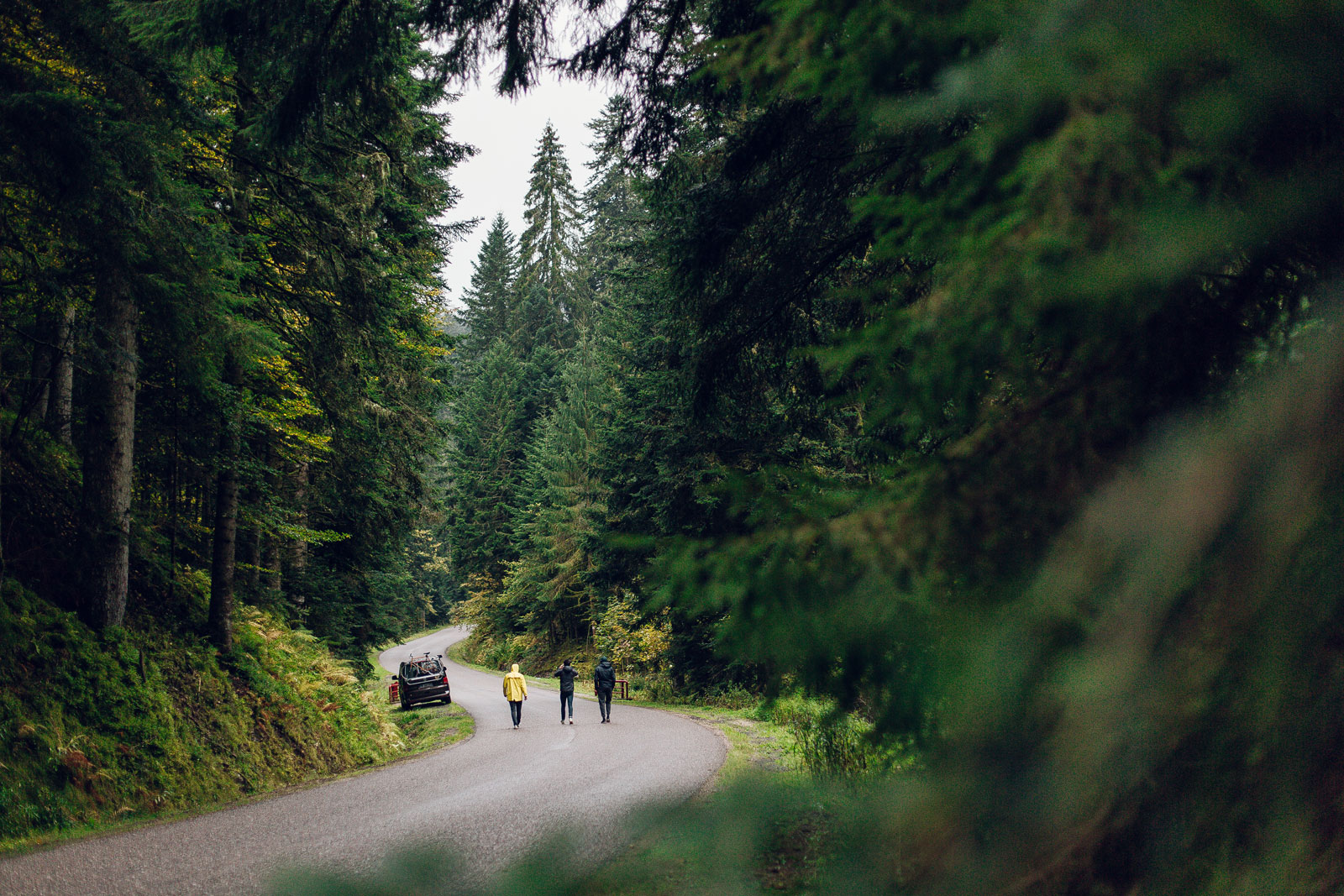 Après avoir rempli le coffre de provisions pour trois jours et entré le nom de notre destination dans le GPS, les dés étaient jetés. Notre avenir ne nous appartenait plus et, par définition, nous n’avions plus besoin de nous en préoccuper. Tranquillement, nous nous laissions guider par la douce voix féminine s’échappant du tableau de bord, à travers les routes qui serpentent dans les montagnes brumeuses et enlacent les épaisses forêts de sapins. Ces dernières présentent d’ailleurs une particularité remarquable, celle de ne laisser passer aucun signal, forçant la déconnexion complète pour le plus grand bien de tous. Nous sommes arrivés de nuit au lac de Longemer et, après en avoir fait le tour complet, nous avons emprunté un chemin de terre nous invitant à nous installer à l’abri du monde, au plus profond des bois.