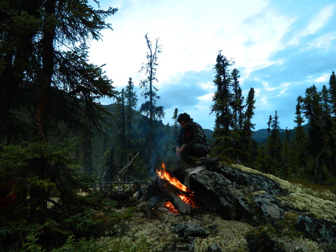 Après une heure de marche je suis déjà épuisé et ressens un sentiment d’impuissance. Comment vais-je pouvoir atteindre l’Océan Arctique à temps ? Je regarde le côté opposé de la rivière. Là-bas, le sol semble plat entre l’eau et les montagnes. Cela ne me rassure pas vraiment, en général, là ou il y a du plat, il y a des marécages. Pourtant en y regardant de plus près, j’aperçois de grands sapins espacés. Pour que de tels arbres puissent pousser là, il faut que le sol soit solide, que la terre soit bonne. Enfin je crois.
