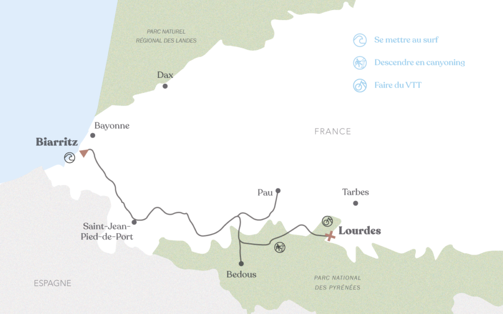 Des bords de l’Atlantique au coeur des Pyrénées, on enchaine les expériences bien sportives au plus près de la nature, avant de se réconforter autour de bonnes spécialités du terroir.