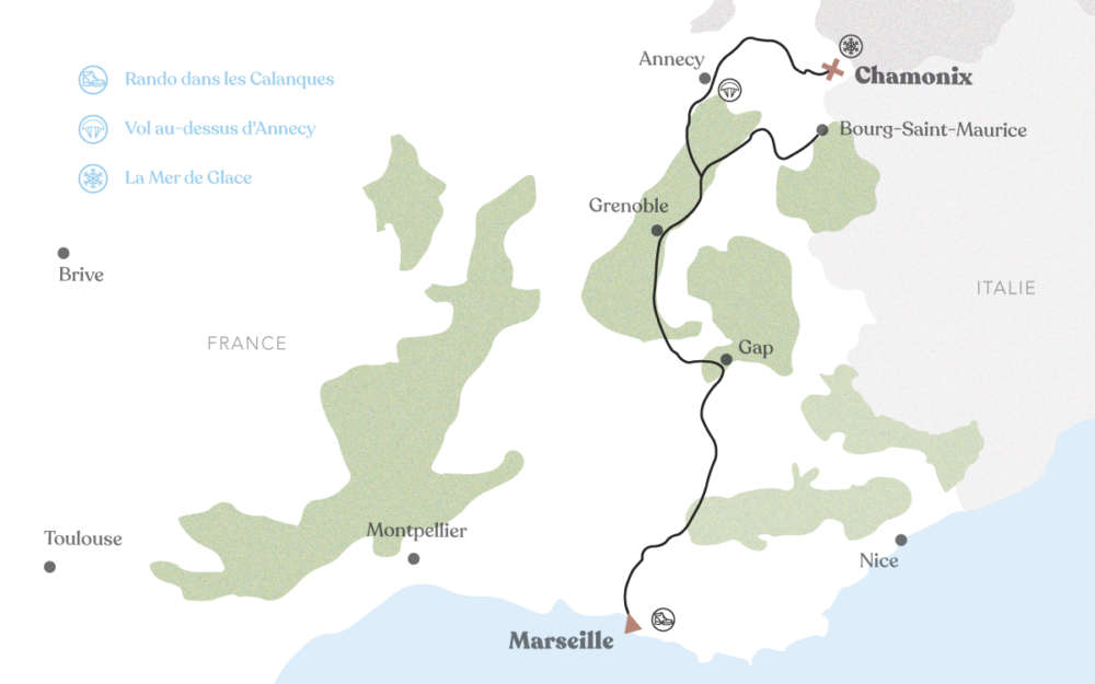 Après un premier itinéraire de Brest à Clermont-Ferrand et un deuxième des vagues de Biarritz aux sentiers des Pyrénées, on vous embarque dans le Sud Est, de Marseille à Chamonix. Et vous verrez que de la mer Méditerranée à la Mer de Glace, il n’y a qu’un pas ! En chemin : les calanques marseillaises, le lac d’Annecy, les sommets des Arcs, de la bouillabaisse et du fromage. Une aventure testée et validée par Amanda et Camille du blog Un duvet pour deux, en partenariat avec Aigle.
