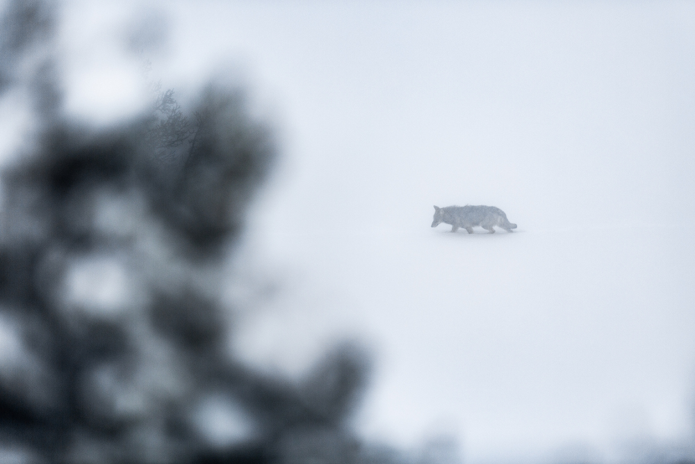 Des frissons se répandent partout en moi. Ce mythe vivant, tant rêvé, passe à quelques centaines de mètres en-dessous de mon poste d’observation, sans même me repérer. Les conditions extrêmes perturbent tous leurs sens. Ils courent, s’arrêtent, marchent, s’enfoncent dans la neige, jouent entre eux. La scène dure environ cinq minutes, je les suis depuis le viseur de mon appareil photo. Puis ils disparaissent derrière le rideau blanc. Fin du spectacle. Difficile de croire ce qu’il vient de se passer, le regard reste suspendu à l’horizon. Un mirage. Ces instants magiques resteront à jamais gravés dans ma mémoire.