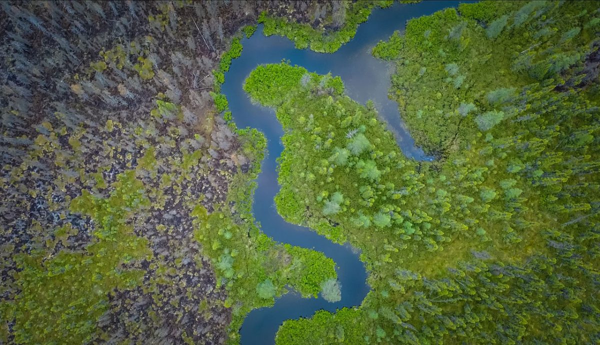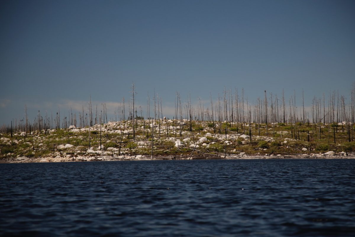 La première ligne est assez délicate, un vent du nord nous amène un fetch en bout de réservoir assez tumultueux, on manque de peu d’échapper le moteur à l’eau qui va nous servir pour les sections de planiols, c’est à dire sans rapides. Après un départ chaotique, nous faisons face à ces étendues vierges. On est subjugués par cette infinie diversité et tous ces tons de vert… Les voix s’estompent pour laisser place à la réflexion. Nous avalons les kilomètres. Les 80 premiers sont de taille, mais se font relativement bien ; jusqu’à ce premier point sur la carte, où nous avions prévu d’emprunter un affluent pour rejoindre le premier lac. Finalement, il y a une belle inclinaison du sol et c’est sec. Le moteur s’arrête, remplacé quasi immédiatement par un bourdonnement sourd qui ne nous quittera désormais plus. Les insectes volants avides de notre sang nous tournent autour par milliers. Il faut sortir les moustiquaires.