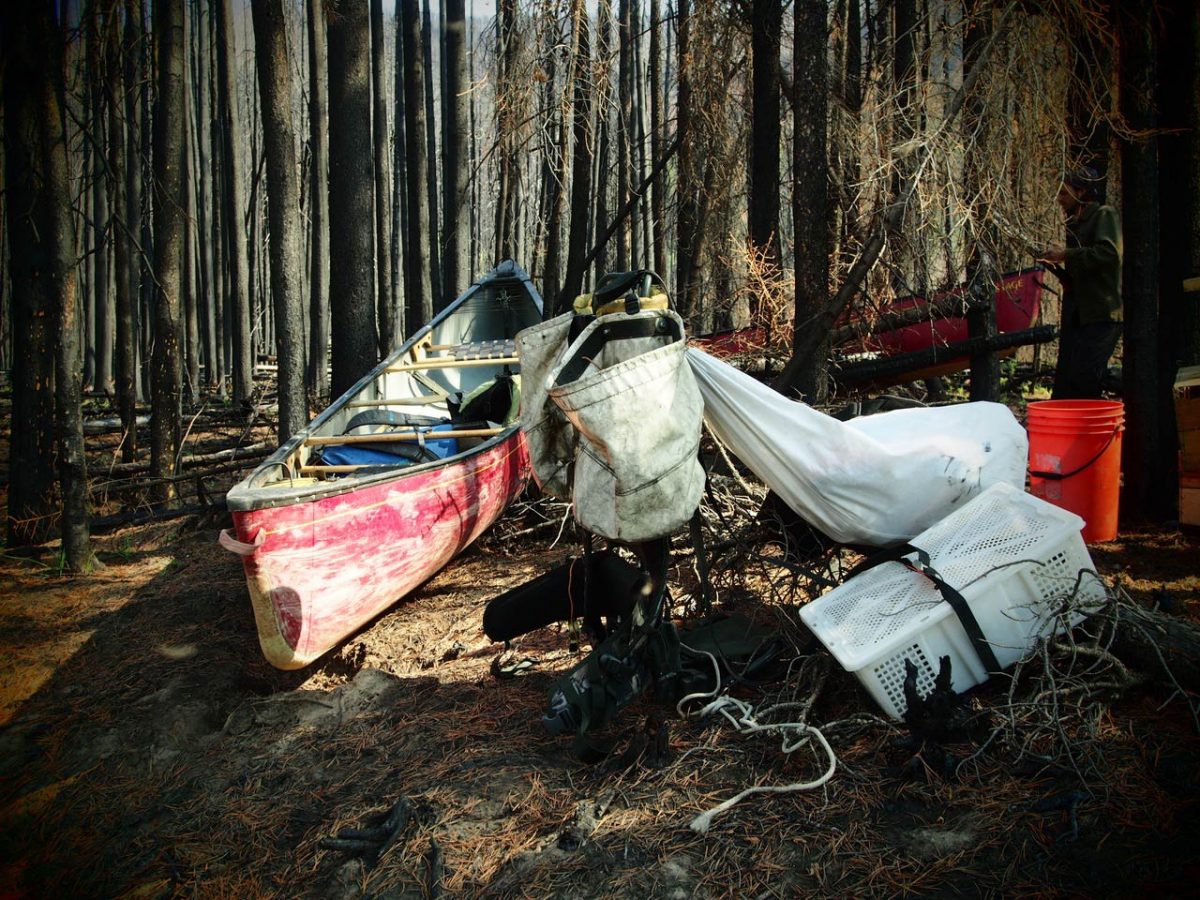 Après deux jours de chaos, lessivés, quasi exténués nous atteignons cette fameuse terre dévastée par les flammes. Les portages entre les rivières, ruisseaux et lacs ont été éprouvants mais nous y sommes. Nous établissons le camp sur une plage de sable laissée par les glaciers aux abords d’un lac. Un ruisseau d’eau fraîche nous permet de maintenir la nourriture à bonne température et d’assouvir notre soif. Et pour manger, nous allons pêcher. Tout simplement. Hormis le court d’eau, qui a gardé une bande verte d’environ un mètre sur ces rives, tout est noir autour de nous. Mais la morille est introuvable.