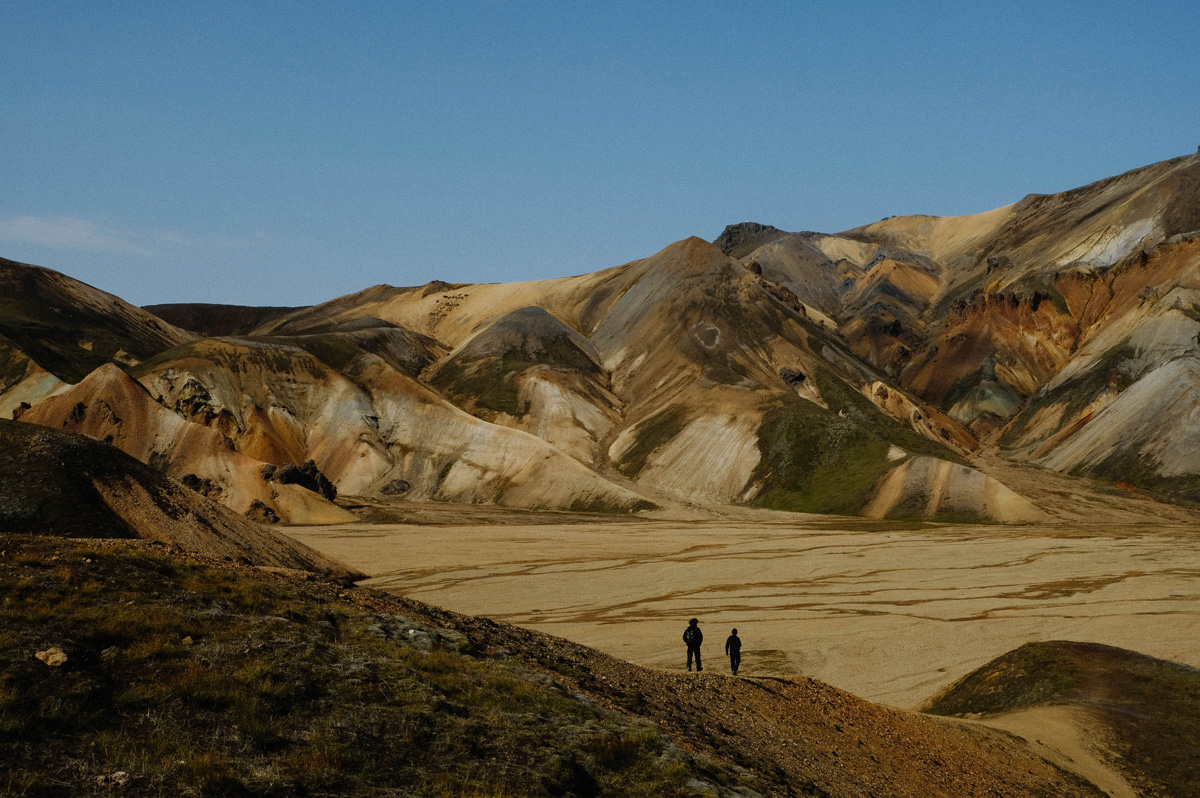 Les couleurs spectaculaires du site volcanique du Landmannalaugar, laissent place aux immenses étendues sombres du centre de l’île. On y découvre un environnement souvent désert, toujours hostile.