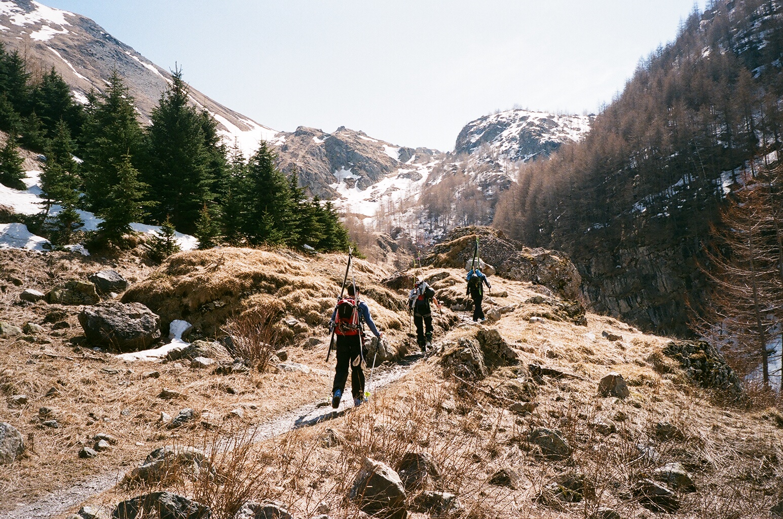 Il faut bien se préparer. La montagne ne se laisse pas si facilement dompter et elle aura toujours le dernier mot. Baudrier, crampons, DVA-pelle-sonde, eau, quelques barres d’énergie… Mon sac à dos de 35 litres est déjà rempli. Je peux à peine y ajouter un petit appareil photo hérité de ma grand-mère et quelques rouleaux de pellicule. Le 35 mm nécessite de ralentir, prendre le temps de regarder. Parfait pour une aventure en ski de fond !