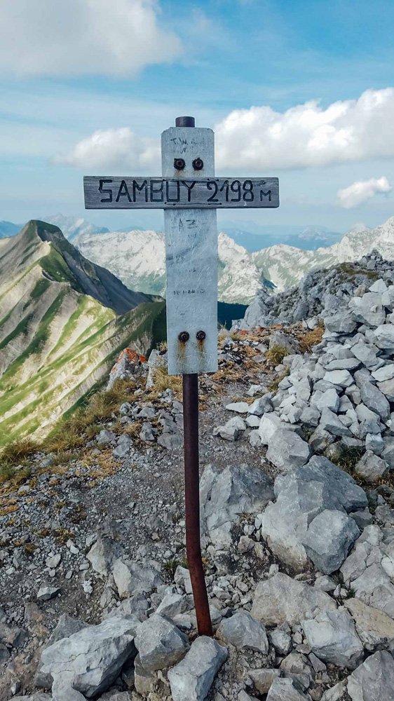 Enfin arrivés dans le cœur des Hautes Bauges, on va pouvoir enchaîner les sommets. On attaque cette deuxième journée par la Grande Sambuy (2 198 m) au-dessus de la station de ski. Le passage final nous prouve encore tout le caractère de ces sommets. Pour rejoindre la Pointe de Chaurionde (2 173 m), il nous faut passer dans une brèche et dés-escalader 100 mètres de paroi avant de rejoindre la crête. Premier problème, je ne savais pas où passe l’itinéraire. Second problème, on n’a ni corde, ni baudrier. Par chance, on tombe sur un local qui nous a propose de passer par une fenêtre, en-dessous du sommet, afin de prendre une sente à chèvres en devers et rejoindre plus « facilement » notre 3e sommet de la liste.