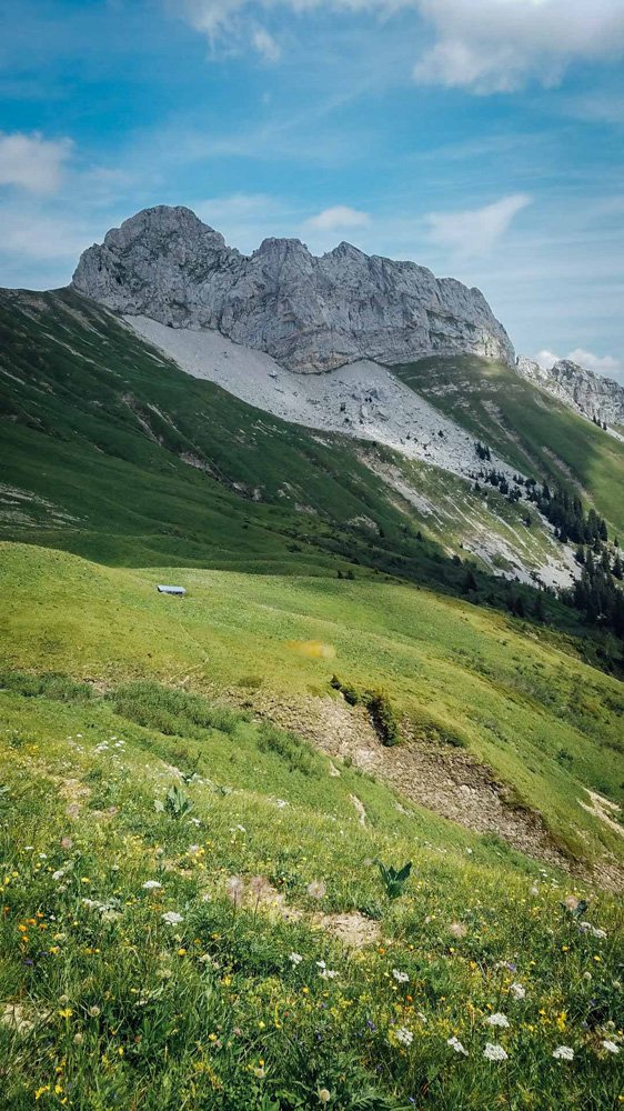 On attaque le quatrième jour avec pour premier objectif le Grand Parra (2 012 m). C’était le dernier des trois sommets que l’on devait aborder de manière « sauvage ». De par son exposition nord-ouest, l’ascension de bon matin est rendue difficile par une végétation très humide. Ne souhaitant pas prendre de risque, je laisse Loris continuer les 300 mètres restant et l’observe avec les jumelles depuis la ferme du chalet des Arbets où nous avions laissé nos sacs.