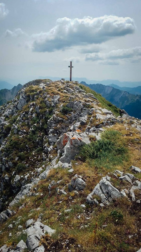 Il nous faut ensuite traverser la vallée. Je propose à Loris de prendre toute la crête jusqu’à l’Alpette pour redescendre sur le col de Tamié. Une arête indiquée, bien tracée, avec même de la main courante sur certaines parties, mais qui s’avère parfois sacrément exposée. On met bien deux heures pour faire 2,5 kilomètres et 300 mètres de dénivelé positif, tant la partie est technique.