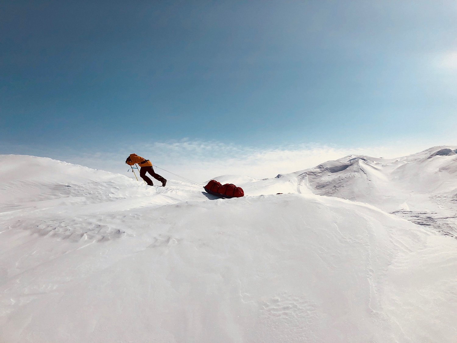 Pendant six mois, on a tout donné pour préparer cette aventure. On devait être prêts le 1er mai 2018. Ce jour là, on prend le bus à Kangerlussuak qui nous dépose au pied du glacier, sur la côte Ouest du Groenland, au niveau du 67e parallèle, avec 30 jours de rations dans nos pulkas. L’objectif est simple : traverser le désert de glace qui nous sépare de la côte opposée en moins d’un mois. Alors ça y est, on y est. La sensation est très particulière quand on pose le premier pied sur la calotte glaciaire. On est à la fois très excité, car on attend ce moment depuis six mois, mais aussi perplexe. Quelque part, on se demande bien dans quoi on s’est embarqué… Mais il n’y a plus le choix !
