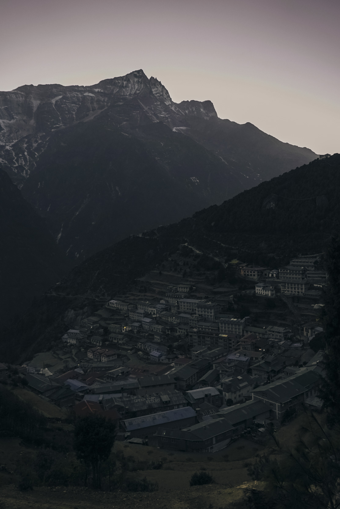 Je ne parviens pas à cadrer la verticalité de Namche Bazaar avec ma camera. Le village forme un véritable amphithéâtre de maisons, suspendues à flanc de montagne. De la rivière Dhudh Kosi, 600 mètres plus bas, à cette une couronne de sommets de plus de 7000 mètres tout autour, les extrêmes se rencontrent ici. Le jour de notre arrivée, nous faisons une montée d’acclimatation récompensée par un point de vue exceptionnel, en tête à tête avec le grand Everest.