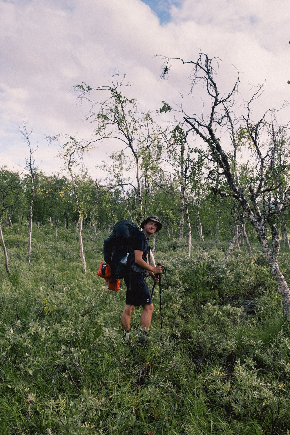 On commence par descendre sur quelques centaines de mètres dans les buissons — les fameux “lichens des rennes” omniprésents depuis notre départ — jusqu’à un panneau, première trace de civilisation depuis qu’on a quitté le parc, indiquant la direction de la Kungsleden. D’ici, on avale une dernière portion de dénivelé positif à bonne allure en se demandant pourquoi on est encore secs… “Mais il fait beau en fait !”