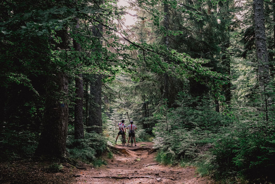 Sur le chemin, on s’autorise une petite baignade rafraîchissante dans un lac. On ressaute rapidement sur nos vélos sans même prendre le temps de se sécher. L’heure tourne. On serre les dents à chaque montée. Vers le milieu de la journée, on entre dans le parc naturel régional des Monts d’Ardèche, une étape marquante de notre parcours. On traverse alors de superbes forêts qui nous protègent du soleil. La deuxième partie de la journée est un pur plaisir : on ne fait que descendre ! Aux petits sentiers succèdent de magnifiques routes en lacets qui offrent de beaux panoramas sur les Monts d’Ardèche. Tout sourire, on atteint Le Cheylard juste à temps pour le match.